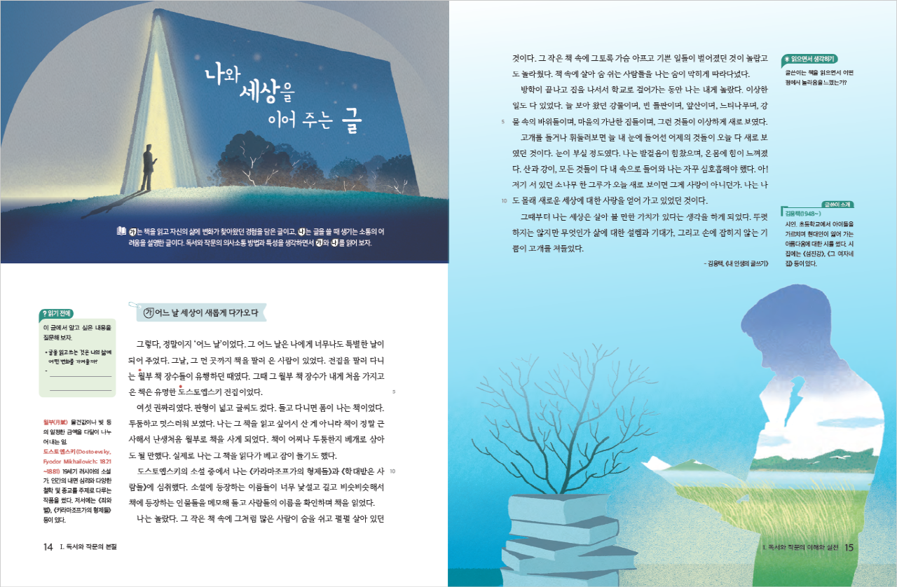 좋은 글과 마주한 특별한 순간을 교과서 표지에 담았습니다.